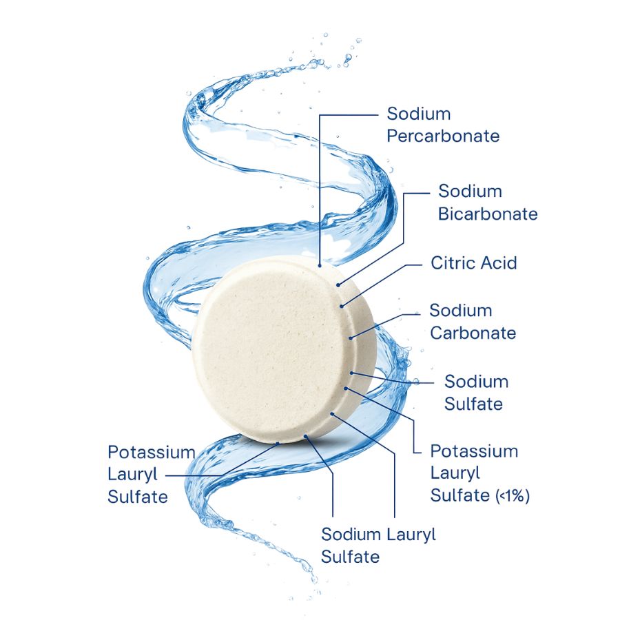 These tablets use a blend of oxygen-based cleaners, food-grade acids and biodegradable ingredients, including: